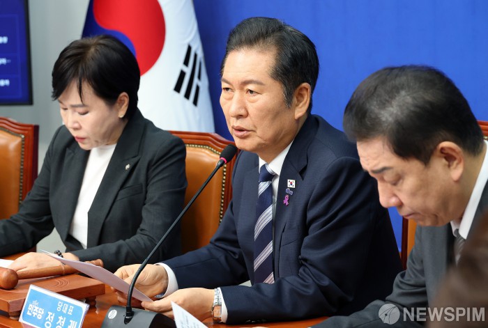 [서울=뉴스핌] 정일구 기자 = 정청래 더불어민주당 대표가 17일 오전 서울 여의도 국회에서 열린 최고위원회의에서 모두발언을 하고 있다. 2025.10.17 mironj19@newspim.com
