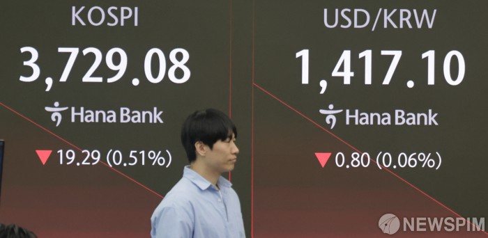 [서울=뉴스핌] 양윤모 기자 = 17일 오전 코스피가 전장 종가보다 19.29 포인트(0.51%) 하락하며 3729.08로, 코스닥은 3.57 포인트(0.41%) 하락한 861.84로 장을 시작한 가운데, 서울 중구 하나은행 딜링룸에서 직원들이 업무를 보고 있다. 서울외환시장에서 달러/원 환율은 전장 대비 0.80원 하락한 1417.10원에 거래를 시작했다. 2025.10.17 yym58@newspim.com