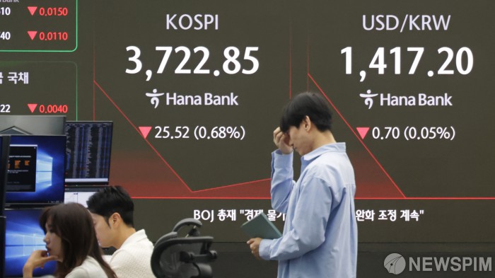 [서울=뉴스핌] 양윤모 기자 = 17일 오전 코스피가 전장 종가보다 25.52 포인트(0.68%) 하락하며 3722.85로, 코스닥은 3.57 포인트(0.41%) 하락한 861.84로 장을 시작한 가운데, 서울 중구 하나은행 딜링룸에서 직원들이 업무를 보고 있다. 서울외환시장에서 달러/원 환율은 전장 대비 0.70원 하락한 1417.20원에 거래를 시작했다. 2025.10.17 yym58@newspim.com