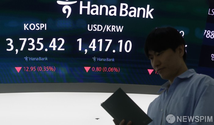 [서울=뉴스핌] 양윤모 기자 = 17일 오전 코스피가 전장 종가보다 12.95 포인트(0.35%) 하락하며 3735.42로, 코스닥은 3.57 포인트(0.41%) 하락한 861.84로 장을 시작한 가운데, 서울 중구 하나은행 딜링룸에서 직원들이 업무를 보고 있다. 서울외환시장에서 달러/원 환율은 전장 대비 0.80원 하락한 1417.10원에 거래를 시작했다. 2025.10.17 yym58@newspim.com