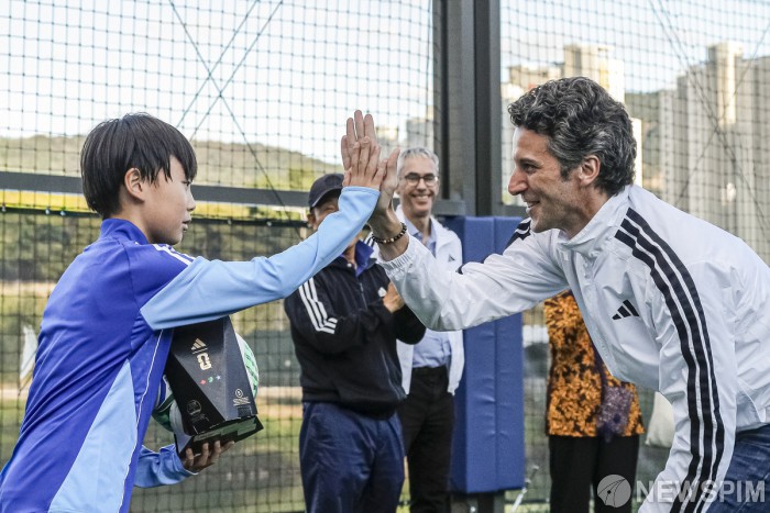 [서울=뉴스핌] 아디다스코리아가 서울시와 함께 ‘서울아 운동하자’ 사회공헌사업의 일환으로 동대문구 휘경2수변공원 풋살장을 새롭게 개보수했다고 17일 밝혔다. 재개장 기념식에서는 차범근 축구교실 코치진과 아디다스 임직원 자원봉사자들이 어린이·장애인 참가자들과 함께 풋살 클리닉이 진행됐다. 아디다스코리아 마커스 모렌트 대표가 참가자들을 응원하고 있다. [사진=아디다스코리아] 2025.10.17 photo@newspim.com