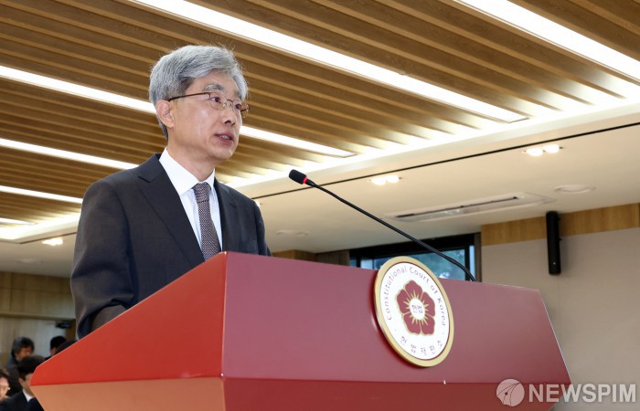 [서울=뉴스핌] 최지환 기자 = 김상환 헌법재판소장이 17일 오전 서울 종로구 헌법재판소에서 열린 헌법재판소 등에 대한 법제사법위원회 국정감사에서 인사말을 하고 있다. 2025.10.17 choipix16@newspim.com