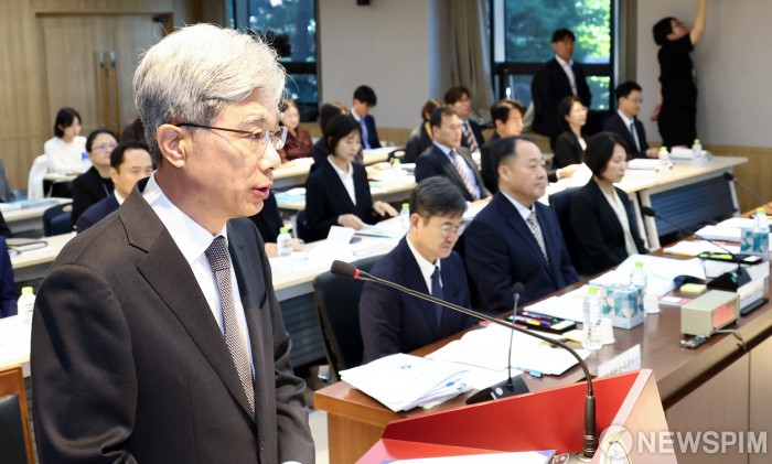 [서울=뉴스핌] 최지환 기자 = 김상환 헌법재판소장이 17일 오전 서울 종로구 헌법재판소에서 열린 헌법재판소 등에 대한 법제사법위원회 국정감사에서 인사말을 하고 있다. 2025.10.17 choipix16@newspim.com