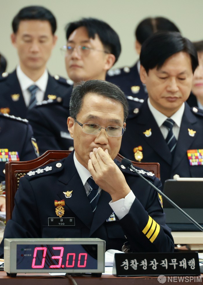 [서울=뉴스핌] 김학선 기자 = 유재성 경찰청장 직무대행이 17일 서울 서대문구 경찰청에서 열린 2025 행정안전위원회 국정감사에서 캄보디아 내 한국인 납치·구금 사태와 관련한 질의를 받으며 생각에 잠겨 있다. 2025.10.17 yooksa@newspim.com