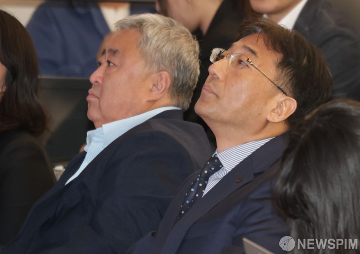 [서울=뉴스핌] 양윤모 기자 = 최근 KT 불법 기지국 20여개가 추가로 발견된 가운데, 17일 서울 KT 광화문 West 사옥에서 서창석 KT 네트워크 부문 부사장(오른쪽)과 이현석 KT 부사장이 KT 소액결제 피해 관련 기자 브리핑을 하기전 생각하고 있다. 2025.10.17 yym58@newspim.com