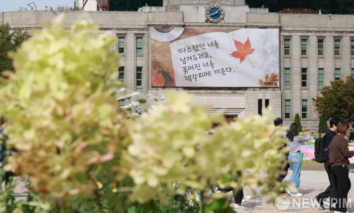 [서울=뉴스핌] 김학선 기자 = 17일 서울 중구 서울도서관 외벽 대형 글판인 서울꿈새김판이 가을을 맞아 '따스했던 너를 남겨두려고, 붉어진 너를 책갈피에 끼운다'라는 문구로 새 단장되어 있다. 2025.10.17 yooksa@newspim.com