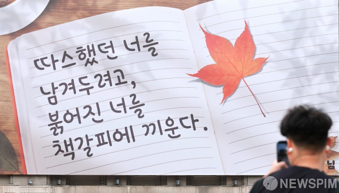 [서울=뉴스핌] 김학선 기자 = 17일 서울 중구 서울도서관 외벽 대형 글판인 서울꿈새김판이 가을을 맞아 '따스했던 너를 남겨두려고, 붉어진 너를 책갈피에 끼운다'라는 문구로 새 단장되어 있다. 2025.10.17 yooksa@newspim.com