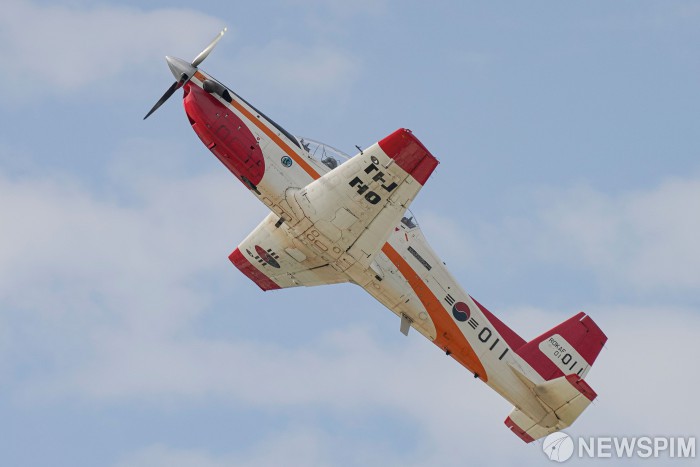 [성남=뉴스핌] 류기찬 기자 = 2025 서울 ADEX 개막일인 17일 오후 경기 성남시 서울공항에서 KT-1 웅비가 단기기동을 선보이고 있다. 2025.10.17 ryuchan0925@newspim.com