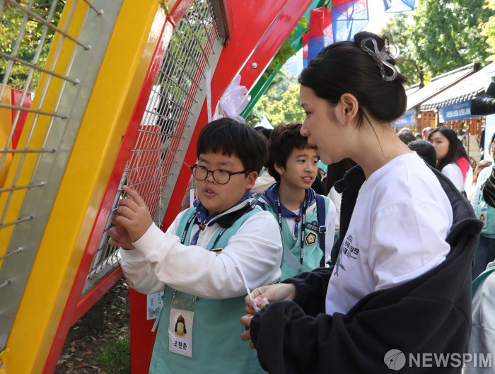 [서울=뉴스핌] 양윤모 기자 = 17일 서울 관악구 낙성대공원에서 열린 '2025 관악강감찬축제'의 첫날, 축제의 마스코트 ‘리틀 강감찬’으로 선발된 아이가 소원 터널에서 자신의 소원 종이를 걸 위치를 찾고 있다. 관악강감찬축제 1일차는 강감찬장군 추모제향으로 시작해 오후에는 인헌 휘호대회, 인헌 예술제(시 낭송회)가 개최됐다. 저녁 7시 대광장에서는 인디밴드 경연대회 ‘비더스타’ 우승자 Top 3팀과 초청밴드 ‘극동 아시아 타이거즈’의 화려한 무대가 펼쳐진다. [사진=관악구청] 2025.10.17 yym58@newspim.com