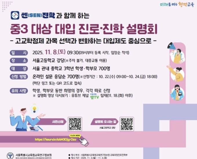 쎈(SEN)진학과 함께하는 중3 대상 대입 진로·진학 설명회 웹포스터. [사진=서울시교육청]
