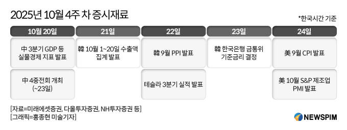 23일에는 한국은행 금융통화위원회(금통위) 본회의에서 10월 기준금리가 결정된다. 한국은행은 지난 회의에서 물가 안정과 금융 불안을 이유로 금리를 동결했으며 이번에도 같은 기조를 유지할 것이라는 전망이 나온다. 한때 10월 금리 인하 가능성이 제기됐으나, 최근 동결에 무게가 실리고 있는 상황이다.