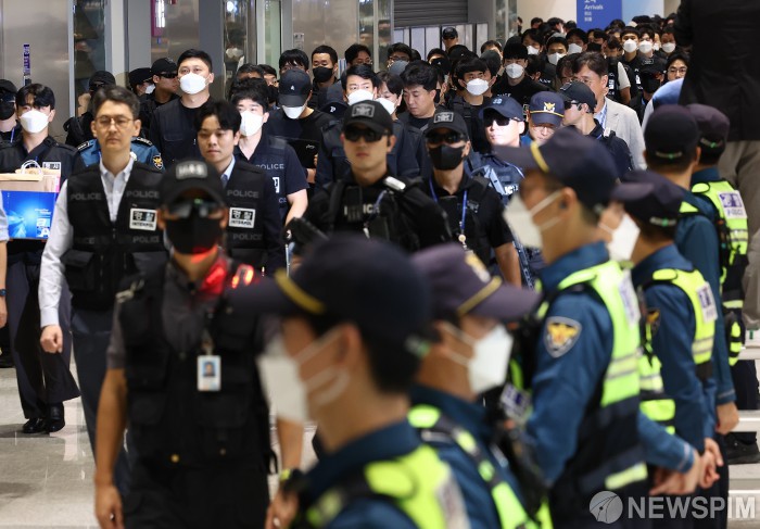 [영종도=뉴스핌] 이형석 기자 = 캄보디아에 구금돼 있던 한국인 64명이 18일 오전 인천공항을 통해 송환되고 있다. 이들은 보이스피싱 등 국제 범죄 조직에 가담한 혐의를 받고 있다. 2025.10.18 leehs@newspim.com