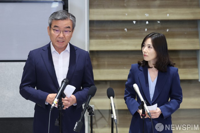 [서울=뉴스핌] 이형석 기자 = 캄보디아로 파견된 정부 합동대응팀 단장인 김진아 외교부 2차관(오른쪽)과 박성주 경찰청 국가수사본부장이 18일 인천국제공항 제2터미널에서 기자회견을 진행하고 있다. 2025.10.18 leehs@newspim.com