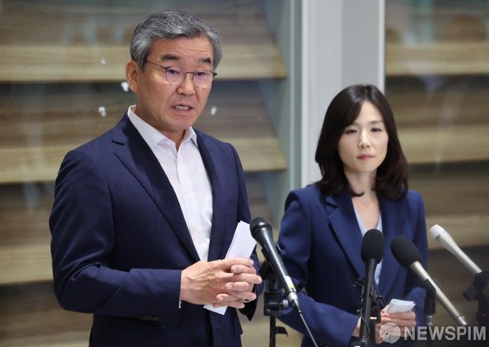 [서울=뉴스핌] 이형석 기자 = 캄보디아로 파견된 정부 합동대응팀 단장인 김진아 외교부 2차관(오른쪽)과 박성주 경찰청 국가수사본부장이 18일 인천국제공항 제2터미널에서 기자회견을 진행하고 있다. 2025.10.18 leehs@newspim.com