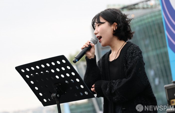 [서울=뉴스핌] 정일구 기자 = '히든스테이지 시즌3 TOP10' 무화가 18일 오후 서울 서초구 반포한강공원 세빛섬 야외무대에서 감엔터테인먼트 주최로 열린 '2025 한강 청년 버스킹 축제'에서 라이브 공연을 선보이고 있다. 2025.10.18 mironj19@newspim.com
