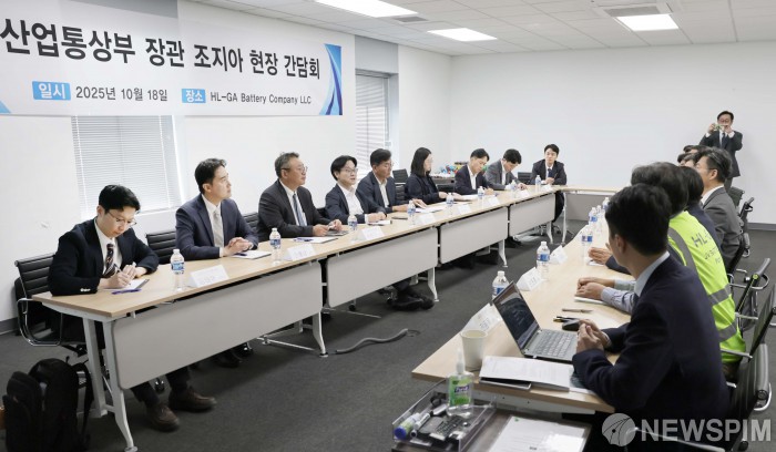 [서울=뉴스핌] 김정관 산업통상부 장관이 18일(현지시간) 미국 조지아주 서배나에 위치한 LG에너지솔루션 배터리 공장 건설 현장을 방문해 관계자들을 격려하고 있다. [사진=산업통상자원부] 2025.10.19 photo@newspim.com
