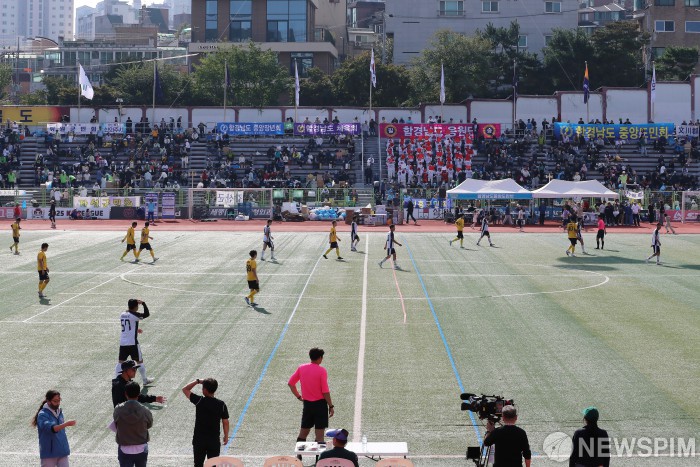 [서울=뉴스핌] 19일 오후 서울 용산구 효창운동장에서 열린 제43회 대통령기 이북도민 체육대회에서 선수들이 축구 경기를 펼치고 있다. [사진=행정안전부] 2025.10.19 photo@newspim.com