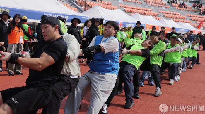 [서울=뉴스핌] 19일 오후 서울 용산구 효창운동장에서 열린 제43회 대통령기 이북도민 체육대회에서 선수들이 줄다리기 경기를 하고 있다. [사진=행정안전부] 2025.10.19 photo@newspim.com
