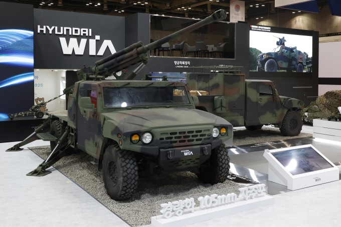 현대위아가 20일 경기도 고양시 KINTEX에서 개막한 '서울 국제 항공우주 및 방위산업 전시회 2025(Seoul ADEX 2025)'에서 공개한 경량화 105㎜ 자주포. [사진=현대위아] |