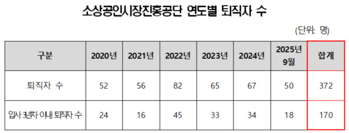 20일 국회 산업통상자원중소벤처기업위원회 소속 서왕진 조국혁신당 의원이 소진공으로부터 제출받은 자료에 따르면, 2020년부터 올해 9월까지 약 6년간 입사 3년 이내 퇴사자는 170명에 달했다. 이는 같은 기간 전체 퇴사자(372명) 중 45%에 달하는 수준이다.
