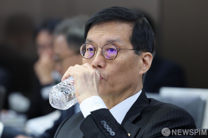 [서울=뉴스핌] 김학선 기자 = 이창용 한국은행 총재가 20일 오전 서울 중구 한국은행에서 열린 국회 기획재정위원회의 한국은행에 대한 국정감사에서 물을 마시고 있다. 2025.10.20 yooksa@newspim.com