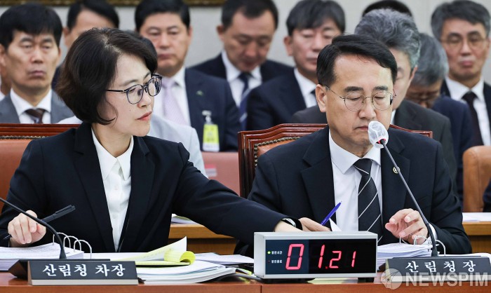 [서울=뉴스핌] 윤창빈 기자 = 김인호 산림청장, 이미라 산림청 차장이 20일 국회에서 열린 농림축산식품해양수산위원회의 산림청 등에 대한 국정감사에서 자료를 살펴보고 있다. 2025.10.20 pangbin@newspim.com