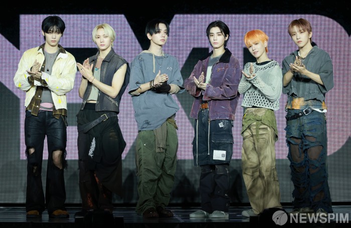 [서울=뉴스핌] 김학선 기자 = 그룹 보이넥스트도어(성호, 리우, 명재현, 태산, 이한, 운학)가 20일 서울 강서구 KBS아레나에서 열린 미니 5집 ‘The Action’ 쇼케이스에서 포즈를 취하고 있다. 2025.10.20 yooksa@newspim.com
