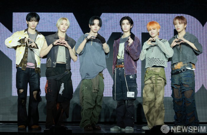[서울=뉴스핌] 김학선 기자 = 그룹 보이넥스트도어(성호, 리우, 명재현, 태산, 이한, 운학)가 20일 서울 강서구 KBS아레나에서 열린 미니 5집 'The Action' 쇼케이스에서 포즈를 취하고 있다. 2025.10.20 yooksa@newspim.com