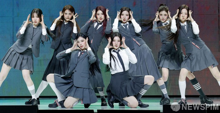 [서울=뉴스핌] 류기찬 기자 = 걸그룹 하츠투하츠(Hearts2Hearts)가 20일 오후 서울 용산구 블루스퀘어 SOL트래블홀에서 열린 첫 미니앨범 'FOCUS' 발매 기념 미디어 쇼케이스에서 타이틀 곡인 'FOCUS' 무대를 선보이고 있다. 타이틀 곡 'FOCUS'는 빈티지한 피아노 리프가 돋보이는 하우스 장르 기반의 곡으로, 중독성 강한 멜로디와 시크한 보컬이 어우러져 하츠투하츠의 새로운 매력을 선사한 곡이다. 2025.10.20 ryuchan0925@newspim.com