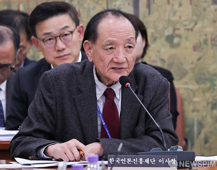 [서울=뉴스핌] 윤창빈 기자 = 김효재 한국언론진흥재단 이사장이 20일 오후 서울 여의도 국회에서 열린 문화체육관광위원회 사행산업통합감독위원회 등에 대한 국정감사에서 의원 질의에 답변하고 있다. 2025.10.20 pangbin@newspim.com