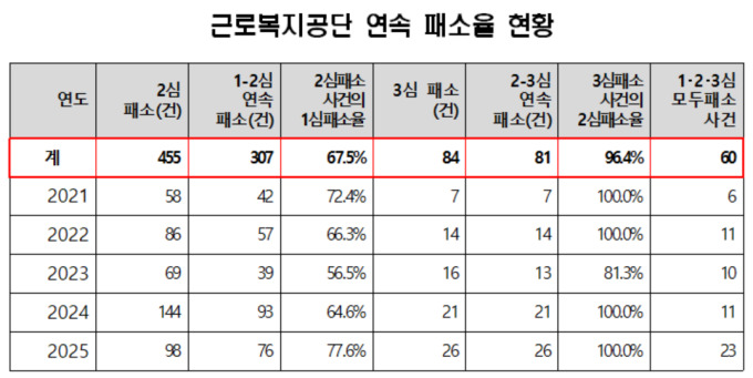 근로복지공단 연속 패소율 현황 [자료=이용우 의원실] 2025.10.21 rang@newspim.com |