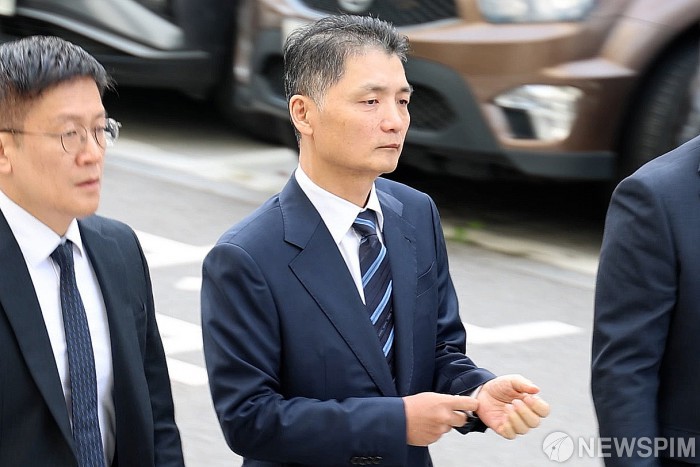 [서울=뉴스핌] 류기찬 기자 = SM엔터테인먼트 시세 조종 혐의를 받는 김범수 카카오 미래이니셔티브센터장이 21일 오전 서울 양천구 서울남부지방법원에서 열린 1심 선고 공판에 출석하고 있다. 2025.10.21 ryuchan0925@newspim.com