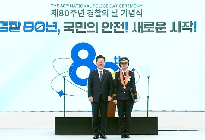 이재명 대통령이 21일 경찰의 날 80주년 기념식에서 이미경 충남 경찰청 경무관에게 홍조근정훈장 유공자 포상을 한 후 기념사진을 찍고 있다. [사진=KTV] |