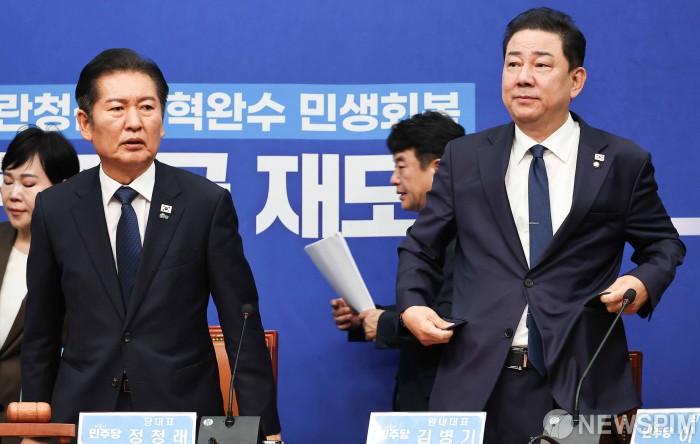 [서울=뉴스핌] 윤창빈 기자 = 정청래 더불어민주당 대표, 김병기 원내대표가 15일 오전 서울 여의도 국회에서 열린 최고위원회의에 참석하고 있다. 2025.10.15 pangbin@newspim.com |