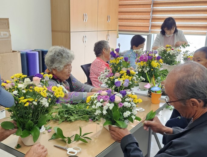 화성특례시 팔탄보건지소 재능기부 프로그램으로 어르신들이 꽂꽂이 활동에 참여하고 있다. [사진=화성시] |