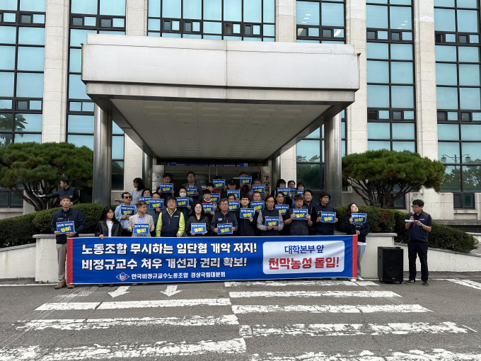 또 "경상국립대 비정규교수는 전체 교원의 약 60%이며 강의의 30% 이상을 담당하지만 대학 주요 의사결정기구에서 배제되고 총장 선출권과 평의원회 참여권이 없다"며 "건강보험 직장가입도 불가능하며 주휴수당과 유급병가도 보장받지 못한다"고 쓴소리를 던졌다.