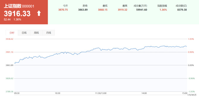 상하이종합지수 3916.33(+52.44, +1.36%)