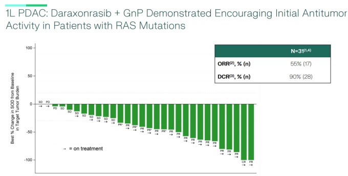 1차 치료에서는 더욱 고무적인 결과가 관찰됐다. 다락손라십 단독요법은 치료 경험이 없는 RAS 돌연변이 췌장암 환자 38명 중 47%의 객관적 반응률을 보였으며, 질병 통제율은 89%에 달했다. 표준 화학요법제인 젬시타빈과 납-파클리탁셀과 병용했을 때는 평가 가능한 31명의 환자에서 55%의 객관적 반응률과 90%의 질병 통제율을 달성했다.