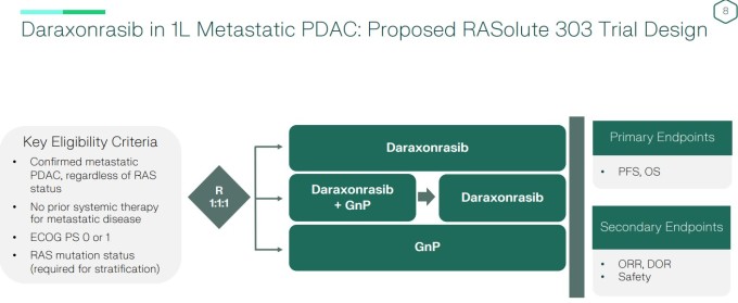 이에 더해 회사는 2025년 4분기에 세 가지 치료군으로 구성된 글로벌 3상 임상시험 RASolute 303을 시작할 계획이다. 이 연구는 1차 전이성 췌장관선암에서 다락손라십 단독요법과 화학요법 병용 다락손라십을 각각 표준 화학요법 치료를 받는 대조군과 비교하여 평가할 예정이다. 이 임상시험 설계는 다락손라십를 단독 요법으로, 그리고 화학 요법과 병용하여 승인을 구할 수 있는 기회를 제공할 것으로 기대된다.