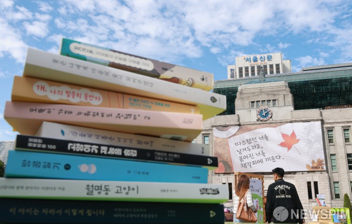 [서울=뉴스핌] 김학선 기자 = 17일 서울 중구 서울도서관 외벽 대형 글판인 서울꿈새김판이 가을을 맞아 '따스했던 너를 남겨두려고, 붉어진 너를 책갈피에 끼운다'라는 문구로 새 단장되어 있다. 2025.10.17 yooksa@newspim.com |