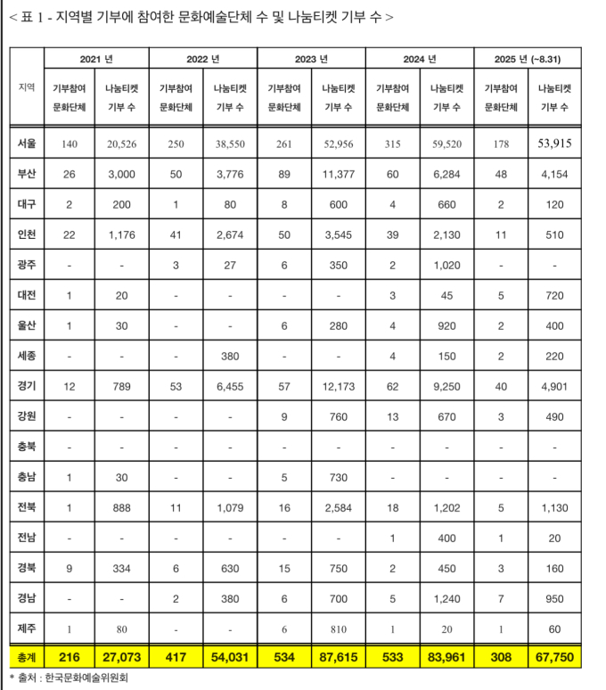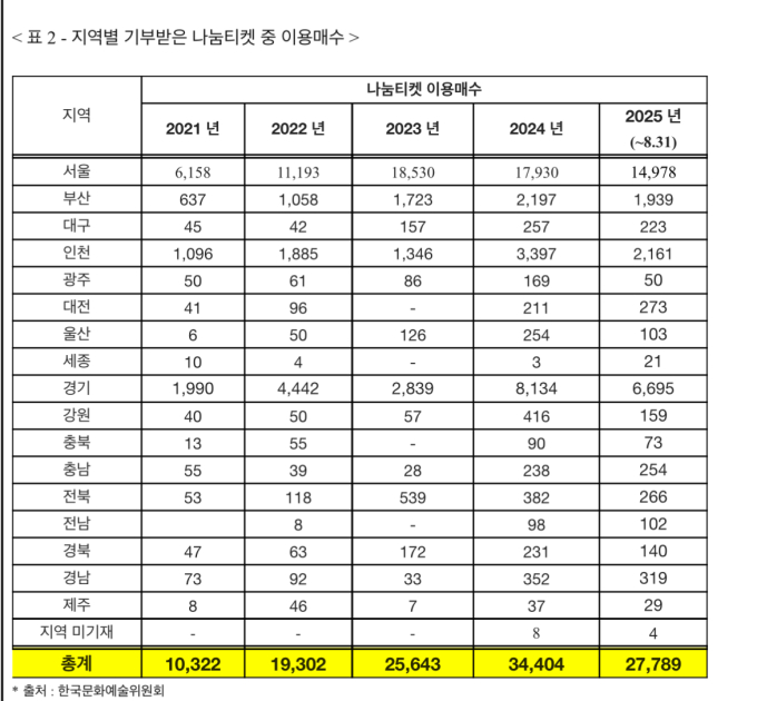 전남의 경우 2021년 ~2025년 8월까지 420장의 기부가 이루어졌지만 지역 내 실제 이용매수는 208건에 그쳐 절반도 안되는(49.5%) 이용률을 보였다. 문화예술 인프라가 잘 구축된 수도권과 비수도권의 격차를 드러나는 대목이다.