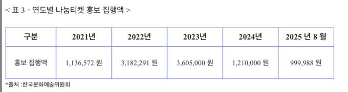 나눔티켓 활용률이 낮은 이유론 홍보 부족도 한몫했다. 실제로 지난 5년간 나눔티켓 홍보 집행액을 살펴보면, 2023년까지는 집행액이 꾸준히 늘었으나 24년부터 급격히 줄어든 것을 확인했다.