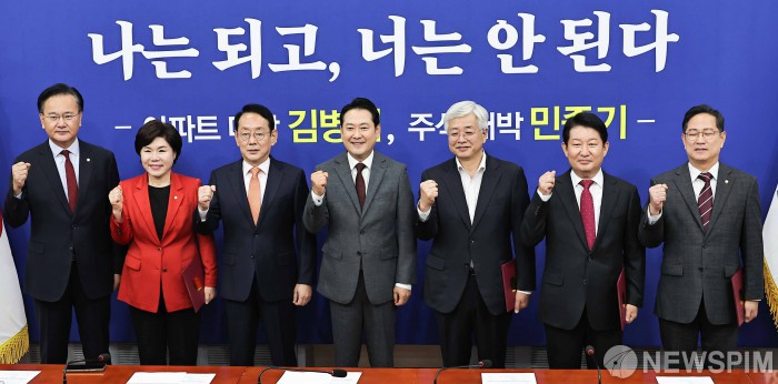 [서울=뉴스핌] 윤창빈 기자 = 장동혁 국민의힘 대표가 22일 오전 서울 여의도 국회에서 열린 부동산 정책 정상화 특별위원회 임명장 수여식 및 제1차 전체회의에서 김도읍 부위원장 등 위원들과 기념촬영을 하고 있다. 2025.10.22 pangbin@newspim.com