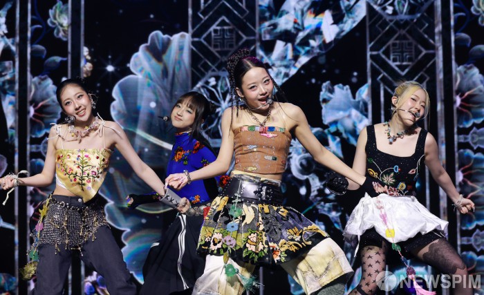 [서울=뉴스핌] 김학선 기자 = 그룹 비비업(VVUP/킴, 팬, 수연, 지윤)이 22일 서울 용산구 블루스퀘어에서 열린 첫 번째 미니앨범 쇼케이스에서 'House Party' 무대를 선보이고 있다. 'House Party'는 세련된 신스 사운드와 경쾌한 하우스 비트가 어우러진 일렉트로닉 장르로, 사이버 감성과 네온빛으로 물든 클럽 무드가 인상적인 곡이다. 2025.10.22 yooksa@newspim.com