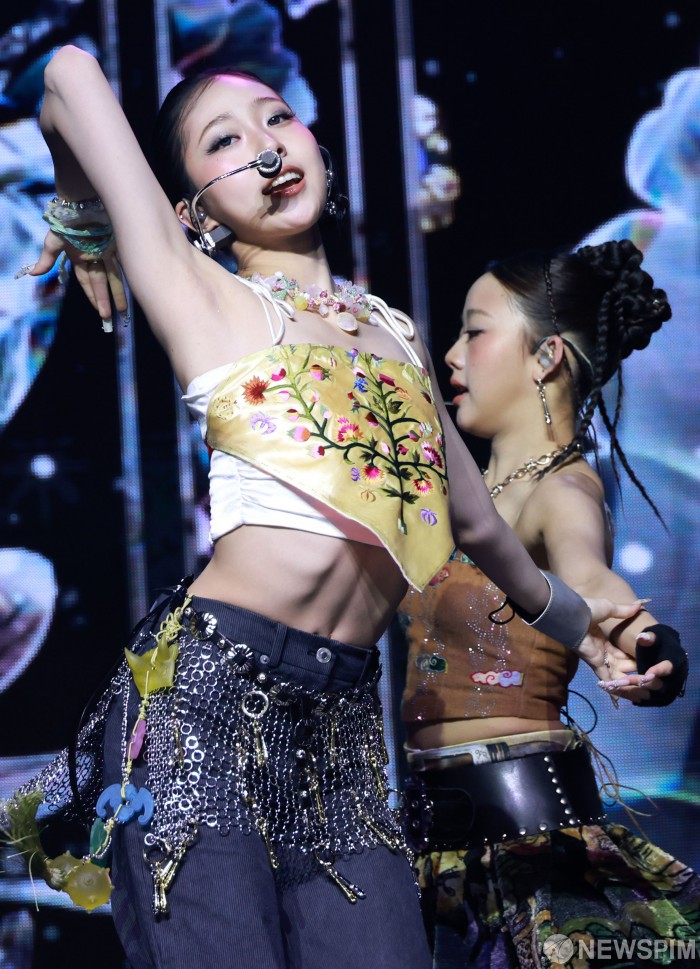 [서울=뉴스핌] 김학선 기자 = 그룹 비비업(VVUP) 지윤이 22일 서울 용산구 블루스퀘어에서 열린 첫 번째 미니앨범 쇼케이스에서 'House Party' 무대를 선보이고 있다. 'House Party'는 세련된 신스 사운드와 경쾌한 하우스 비트가 어우러진 일렉트로닉 장르로, 사이버 감성과 네온빛으로 물든 클럽 무드가 인상적인 곡이다. 2025.10.22 yooksa@newspim.com