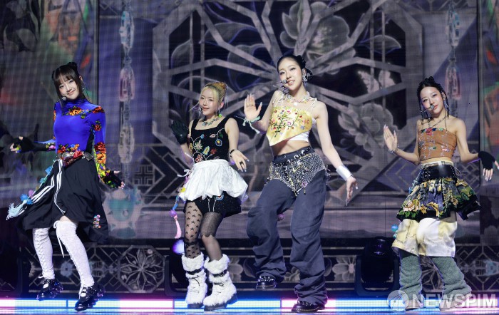 [서울=뉴스핌] 김학선 기자 = 그룹 비비업(VVUP/킴, 팬, 수연, 지윤)이 22일 서울 용산구 블루스퀘어에서 열린 첫 번째 미니앨범 쇼케이스에서 'House Party' 무대를 선보이고 있다. 'House Party'는 세련된 신스 사운드와 경쾌한 하우스 비트가 어우러진 일렉트로닉 장르로, 사이버 감성과 네온빛으로 물든 클럽 무드가 인상적인 곡이다. 2025.10.22 yooksa@newspim.com