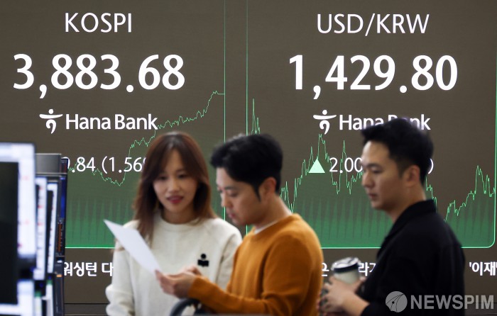 [서울=뉴스핌] 최지환 기자 = 22일 코스피가 59.84포인트(1.56%) 상승한 3883.68에 마감했다. 코스닥지수는 전 거래일보다 6.65포인트(0.76%) 오른 879.15에 거래를 마쳤다. 서울외환시장에서 달러/원 환율은 전날보다 2.0원 오른 1429.8원에 주간거래를 마쳤다. 이날 오후 서울 중구 하나은행 딜링룸에서 딜러들이 업무를 보고 있다. 2025.10.22 choipix16@newspim.com