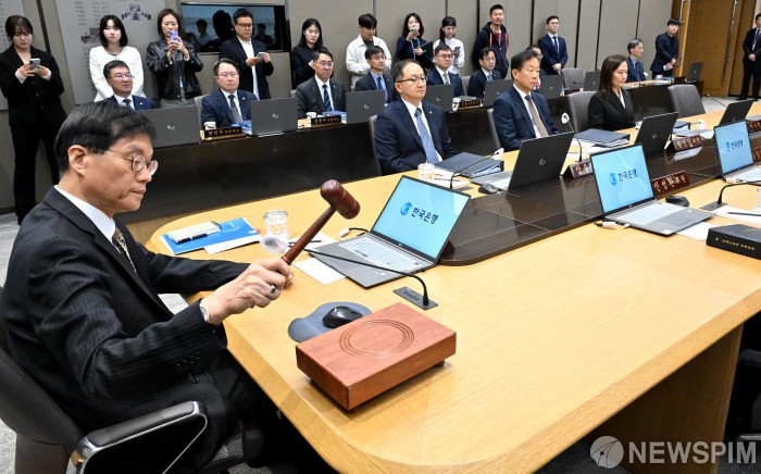 [서울=뉴스핌] 사진공동취재단 = 이창용 한국은행 총재가 23일 오전 서울 중구 한국은행 본관에서 열린 금융통화위원회 본회의에서 의사봉을 두드리고 있다. 한은 금통위는 회의에서 기준금리를 연 2.50%로 동결했다. 2025.10.23 photo@newspim.com