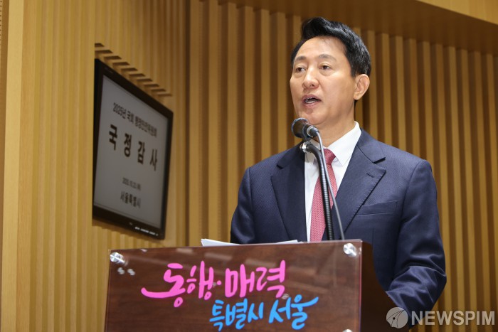 [서울=뉴스핌] 김학선 기자 = 오세훈 서울시장이 23일 서울시청에서 열린 국회 행정안전위원회 국정감사에서 업무보고를 하고 있다. 2025.10.23 yooksa@newspim.com