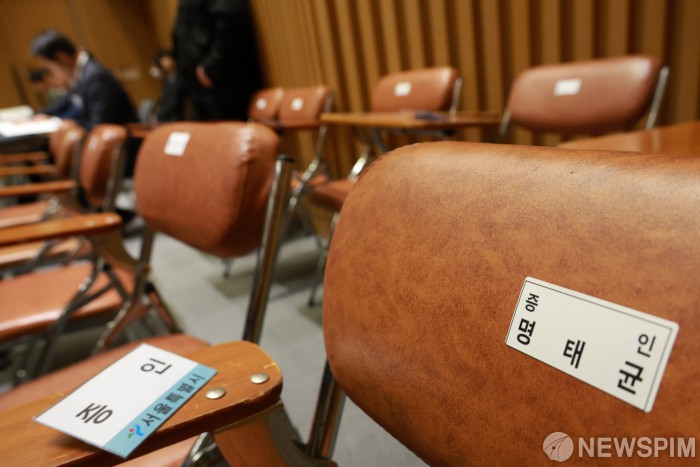 [서울=뉴스핌] 김학선 기자 = 23일 서울시청에서 열린 국회 행정안전위원회 서울시 국정감사에서 증인으로 출석 예정인 명태균씨 자리가 놓여 있다. 2025.10.23 yooksa@newspim.com